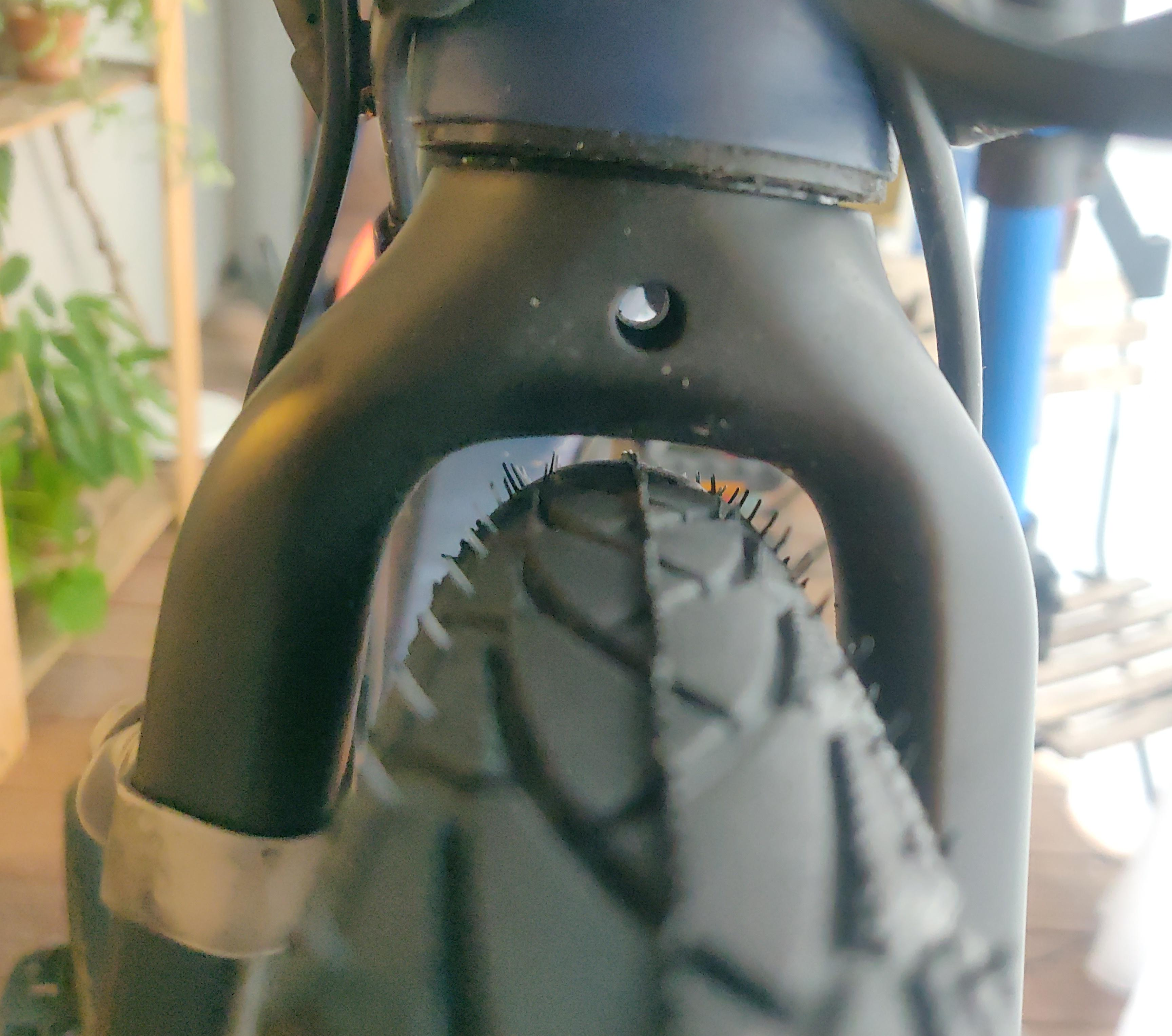 I'll check if the 37-622 (ETRTO) / 28x1.40" / 700x35C (French notation) fits and will update this page accordingly. It probably won't fit either, except if its pressure is kept low and the axle of the wheel isn't seated right in the bottom of the dropouts, but we'll see. I probably should have made a safe choice and bought an even narrower tyre. But I like wide tyres.